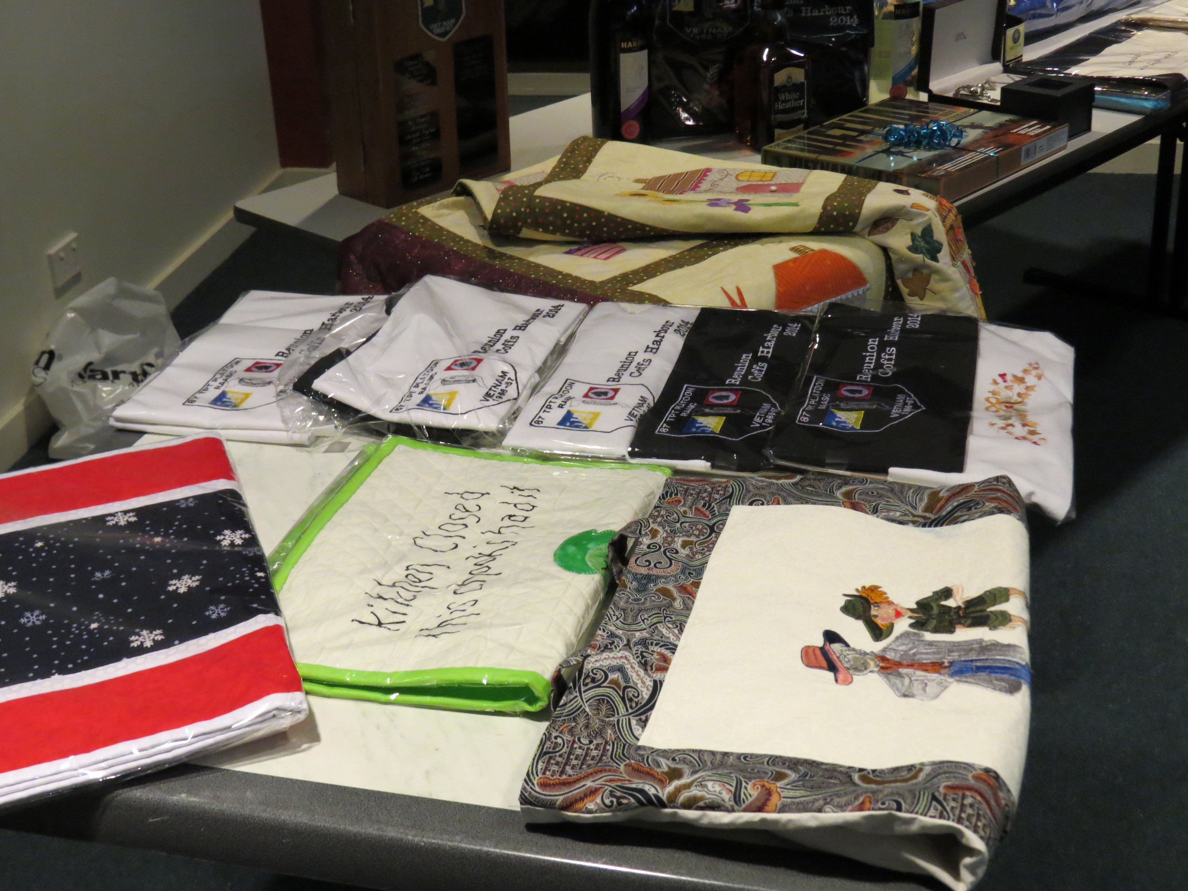 87TPT towels and t towels, xmas table runner, quilted knee rug, embroidered tote bag